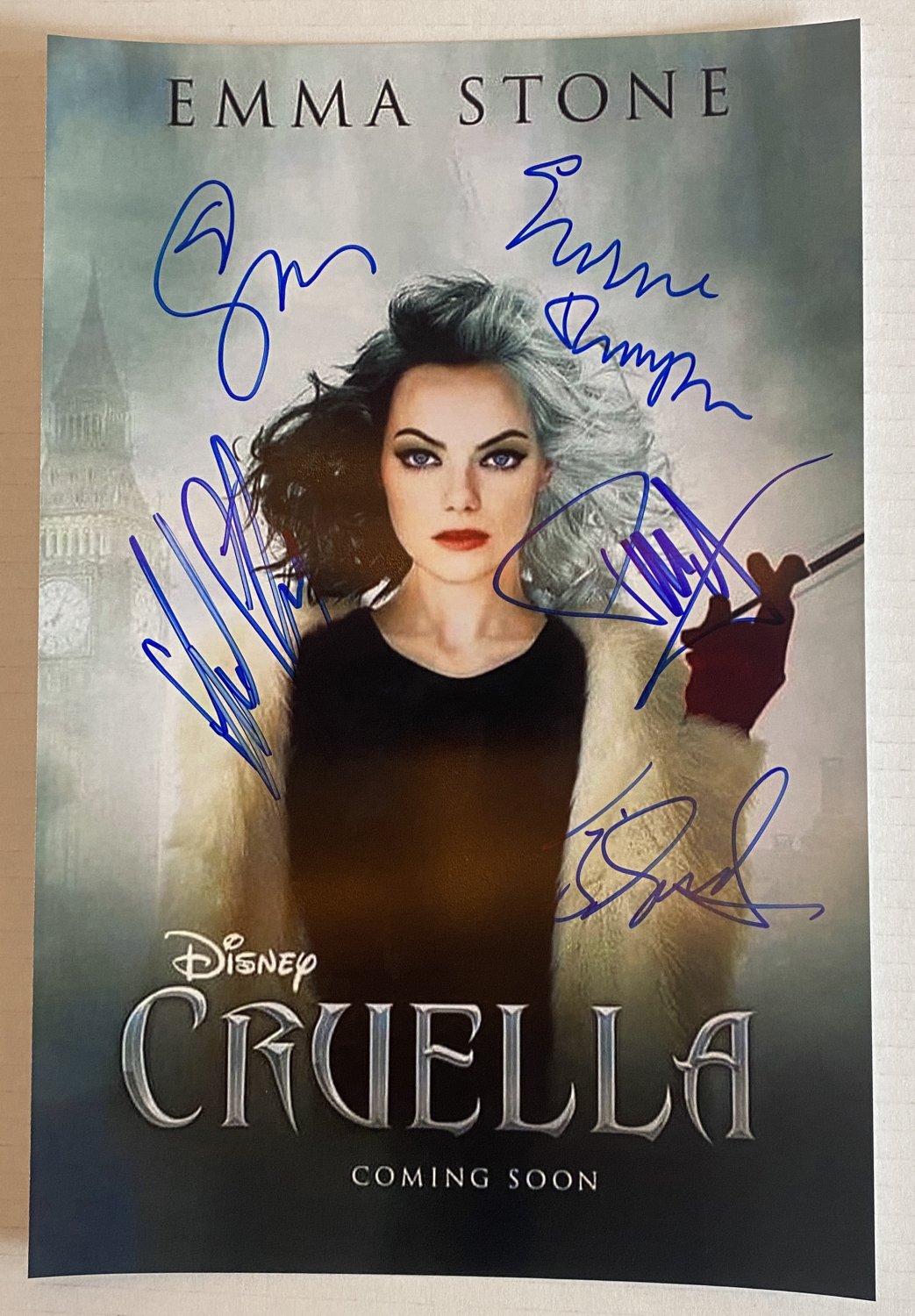The photo has been signed beautifully in blue felt tip marker on the photograph and it looks absolutely stunning. These signed photos are extremely limited as not many were signed. The photograph comes signed by 5 cast members, including, Emma Stone, Emma Thompson, Mark Strong, Paul Walter Hauser and Jamie Demetriou. WOW!!!! It just doesn’t get any nicer or better than this. Only true Cruella fans need apply. Take a look at this beautiful signed photo and you will fall in love right away!