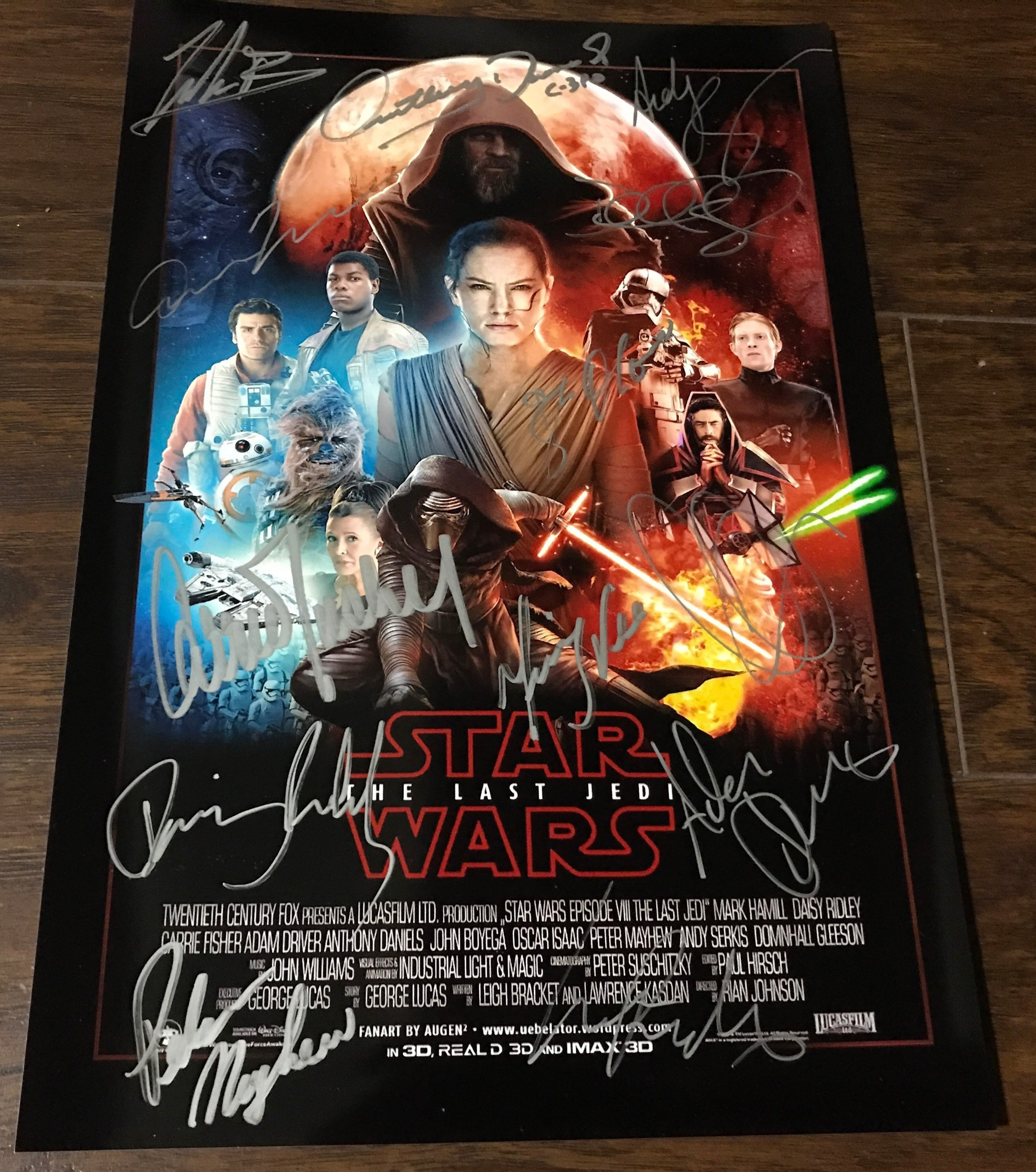 WOW!!!! It just doesn’t get any nicer or better than this. Only true Star Wars The Last Jedi fans need apply. Take a look at this beautiful signed photo and you will fall in love right away! Star Wars autographs make great investments as well with continued value growth in the marketplace. Also. if you know anyone looking for Star Wars The Last Jedi autographs for sale, bring them to us and will give you 10% off your next order.