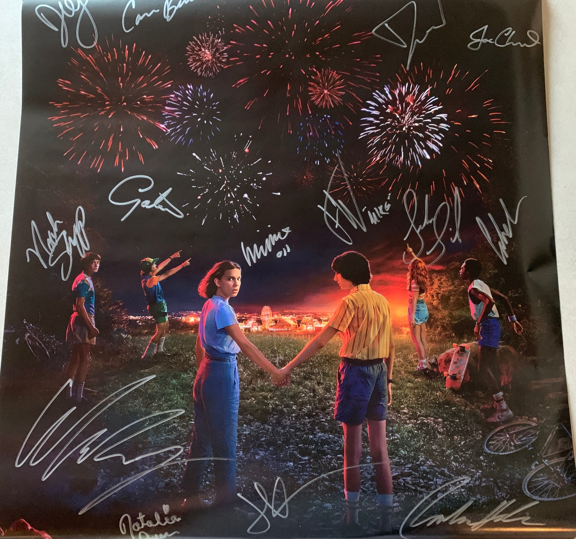 The poster has been signed beautifully in silver felt tip marker on the photograph and it looks absolutely stunning. These signed posters are extremely limited as not many were signed. The poster comes signed by 14 cast members, including, Winona Ryder, Millie Bobby Brown, David Harbour, Finn Wolfhard, Gaten Matarazzo, Caleb McLaughlin, Noah Schnapp, Charlie Heaton, Joe Keery, Natalia Dyer, Cara Buono, Sadie Sink, Joe Chrest and Dacre Montgomery.