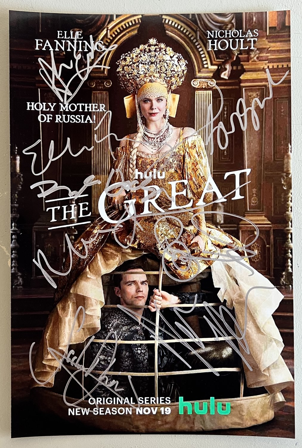 The photo has been signed beautifully in silver felt tip marker on the photograph and it looks absolutely stunning. These signed photos are extremely limited as not many were signed. The photograph comes signed by 8 cast members, including, Elle Fanning, Nicholas Hoult, Phoebe Fox, Sacha Dhawan, Gwilym Lee, Adam Godley, Douglas Hodge and Belinda Bromilow. WOW!!!! It just doesn’t get any nicer or better than this. Only true The Great fans need apply. Take a look at this beautiful signed photo and you will fall in love right away! Also, if you know anyone looking for The Great autographs for sale, bring them to us and we will give you 10% off your next order.